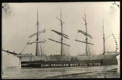 The Mimi was an iron-hulled sailing ship home-ported in Hamburg. It was a four-masted 283-foot 1,984-ton behemoth, built in 1893. Under the direction of Capt. Ludwig Westphal, it wandered in the fog onto a sandy beach at the mouth of the Nehalem River on Feb. 13, 1913.