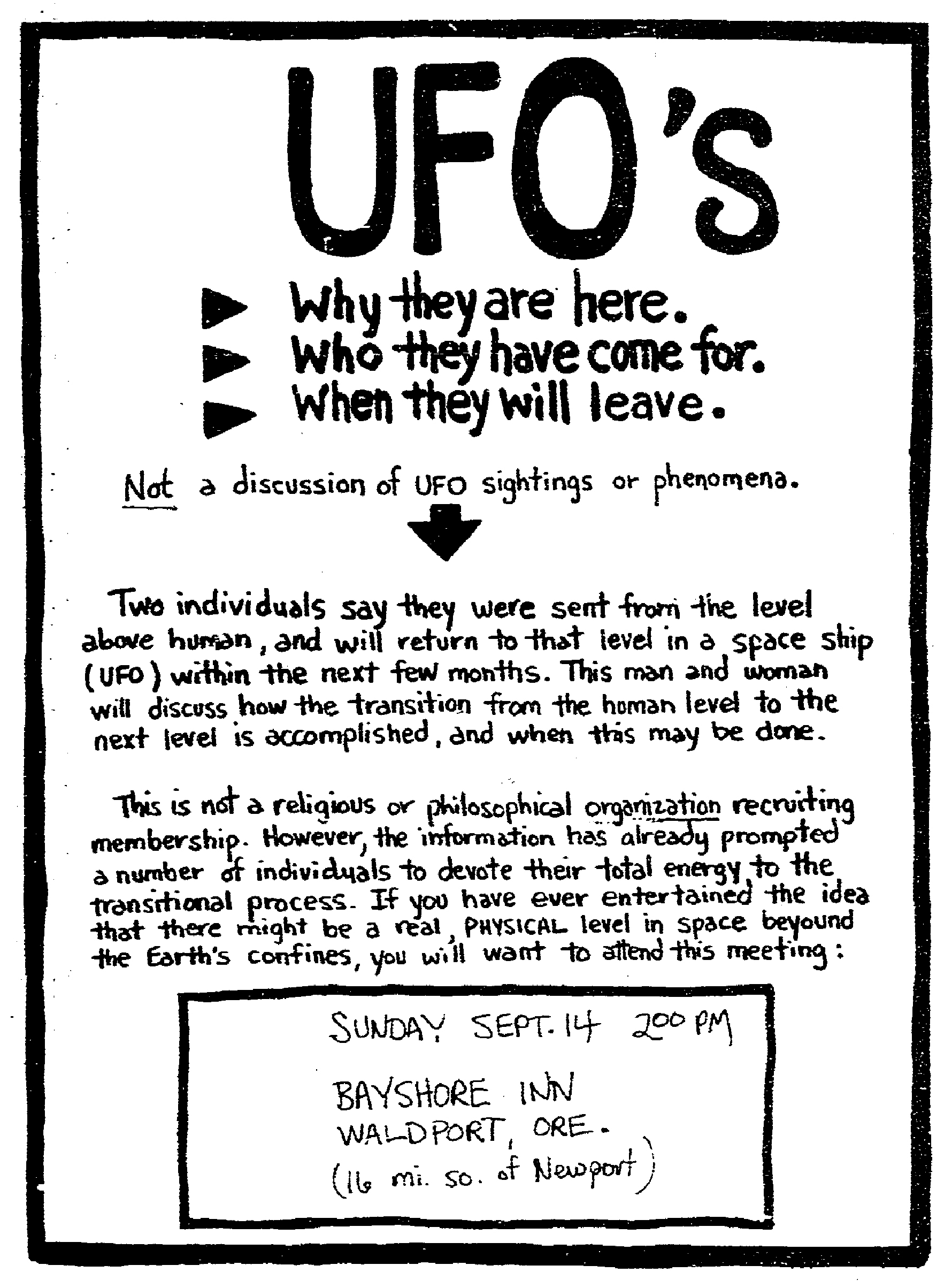 A poster put up by the “Human Individual Metamorphosis” cult at the University of Oregon, encouraging people to attend the meeting in Waldport. (Image: Oregonian)