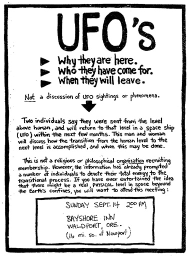These new UFO apostles were specifically instructed that they could have no two-way conversations with the family members they’d left behind — the best they could do was send postcards. Naturally, there was considerable concern about this, especially because many of the postcards were almost identically worded, as if the writer were taking dictation. Reports from the Waldport meeting, after many retellings, started metastasizing into rumors that wouldn’t have been out of place in a Lovecraft novella. People remembered seeing a weird, lambent nimbus of light playing about the heads of the glassy-eyed man and woman, whom no one seemed to be able to identify or even fully describe. One audience member claimed he sensed “an aura of death” in the meeting. Others reported that The Two had prophesied that they were “marked for death” and would soon be “returning to the Next Level” — that they would die after delivering their message, as had John the Baptist and Jesus Christ before them. People started wondering if this all might be leading up to some sort of brainwashing-fueled ritual mass suicide. (Keep in mind that this was several years before the notorious Jonestown incident, so the “creepy cult committing mass suicide” narrative was a considerably bigger leap for people to make in 1976 than it is for us today.)