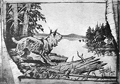 A birchbark drawing, of a bobcat stalking deer by a lake. (Image: Small, Maynard & Co.)