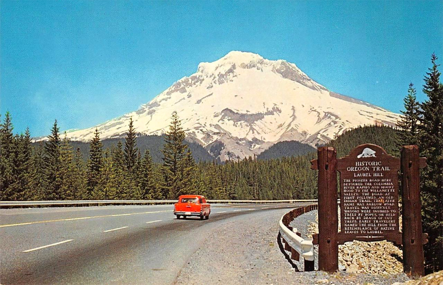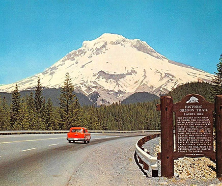 An interpretive sign by the side of Highway 26, the Mount Hood Scenic Highway, identifies the site of Laurel Hill in this postcard image from the 1950s. (Image: Postcard)