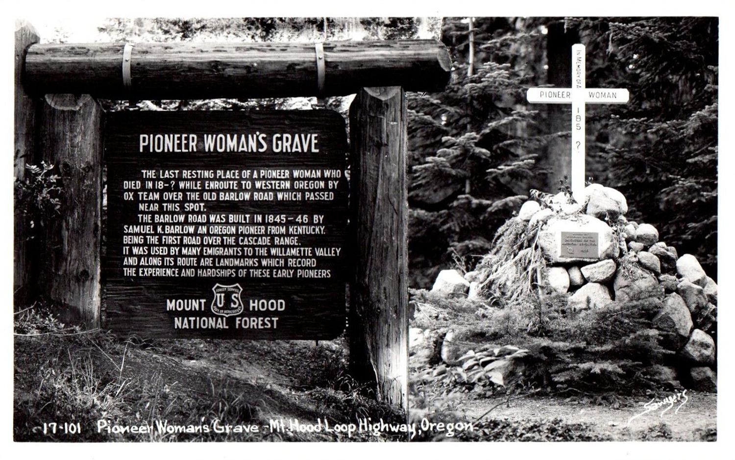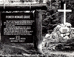This large monument, erected in the 1930s by Civilian Conservation Corps workers, identifies the gravesite of an unknown pioneer woman who died on or near Laurel Hill on the Barlow Road. (Image: Postcard)
