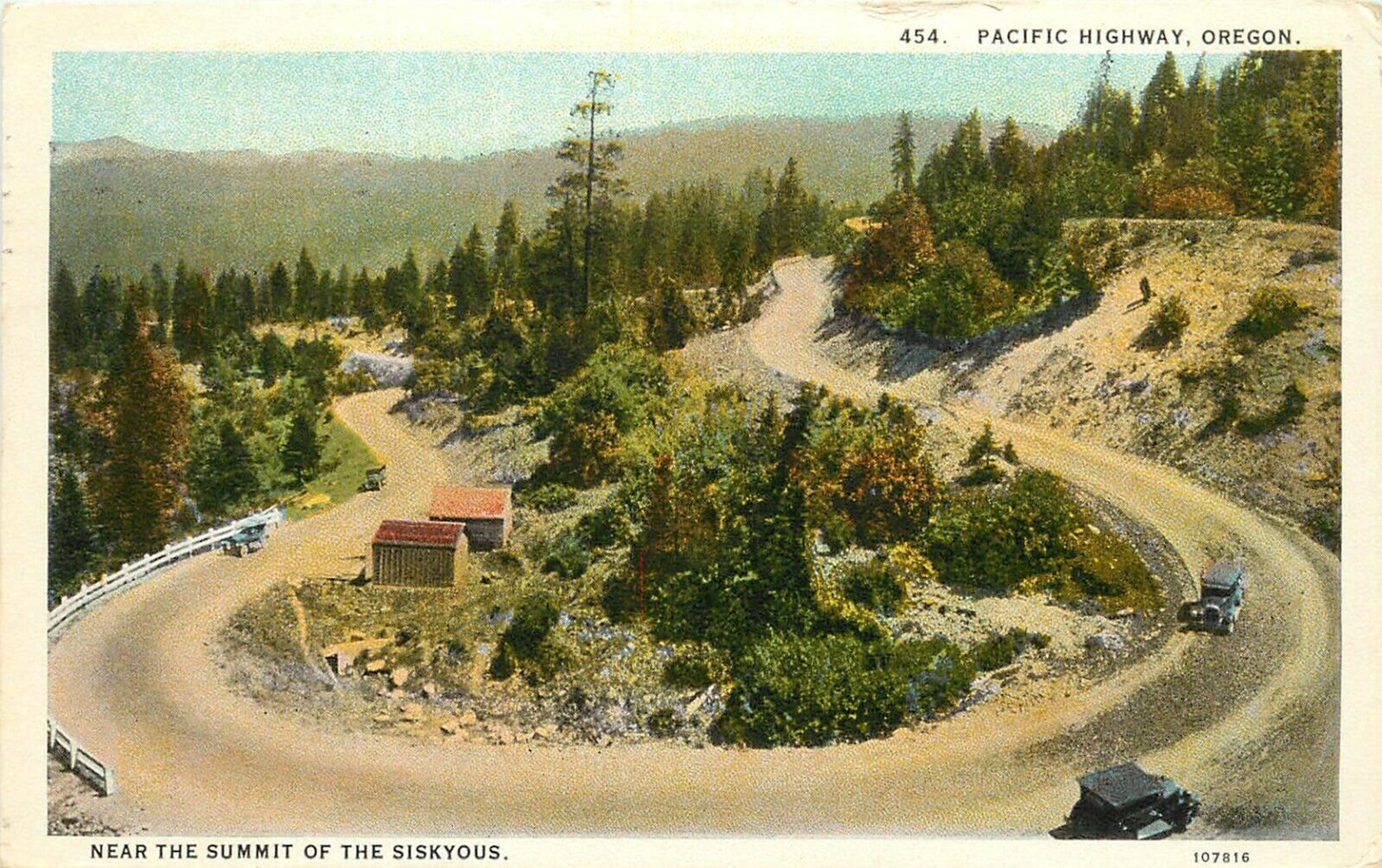 Many of the projects the Highway Department has had to spend lots of gas-tax money on are bridges, such as this especially elegant one across the Umpqua River at Reedsport, on Oregon Highway 101. This bridge is, of course, a Conde McCullouch design. The green center arch is made of painted steel, and swings open to allow ships passage. (Image: Postcard)Many longtime residents also remember times, driving between Eugene and Salem for instance, when they were virtually alone, hurtling along, kings of the highway. Some of us (if you reassure us that the statute of limitations has run out) will admit to having actually switched the lights off for a second, just to see what it's like to be hurtling along at 65 miles an hour in the pitch darkness. Well, those days are gone in the valley, although a trip from The Dalles to Pendleton on I-84 can get pretty lonely sometimes. For younger residents, the freeways seem like part of the landscape: always been here, always will be. But Oregon’s freeway system is a relatively young one. Interstate 5 itself was not finished until 1966, just over 50 years ago. Interstate 205, through the east side of the Portland Metro area, is much newer; it was completed in 1982. And the most recent addition to the system, I-82 near Hermiston, was finished in 1988.