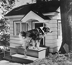 A photo illustration from the Portland Journal showing Bobbie the Wonder Dog on the steps of the mini-bungalow doghouse presented to him at the Home Beautifying Exposition in 1924. (Image: Al Monner/ Oregon Historical Society)