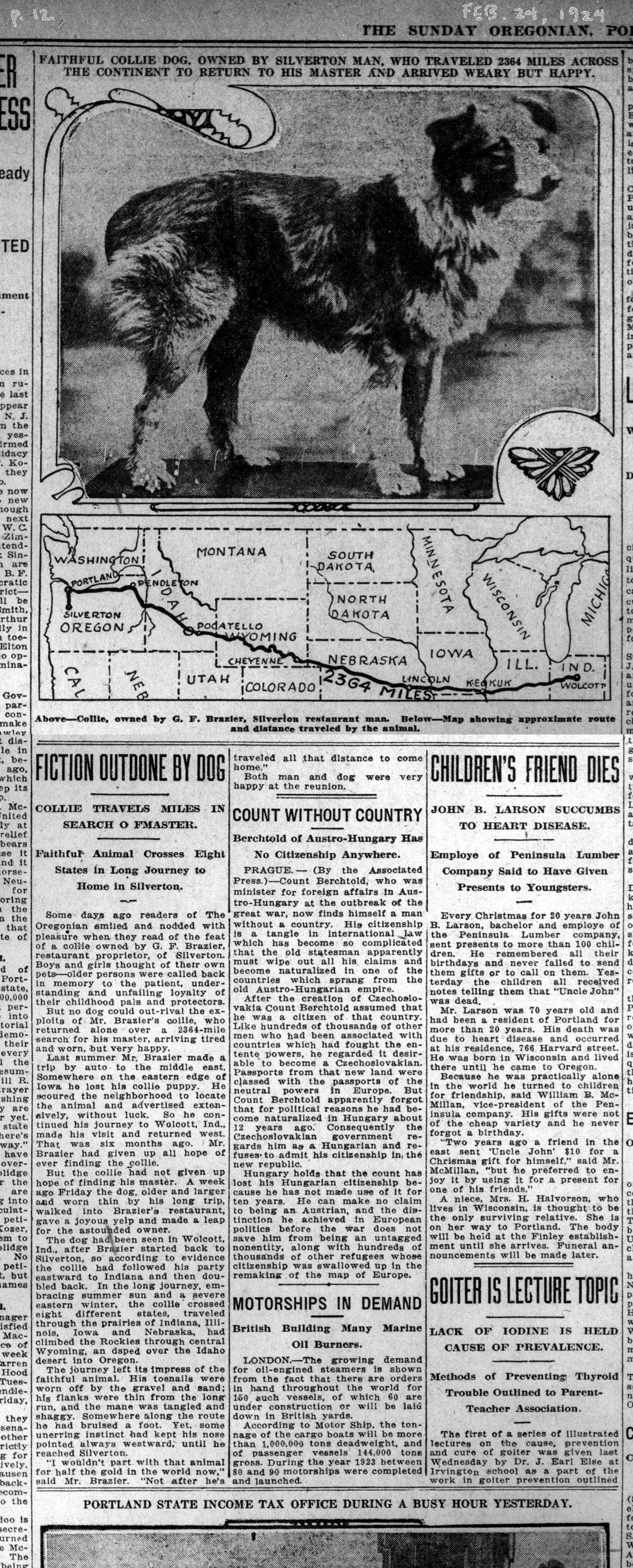 (Sources: Silverton’s Bobbie: His Amazing Journey, a book by Judith Kent published in 2004 by Beautiful America; Wonder Dog: The Story of Silverton Bobbie, a book by Susan Stelljes published in 2005 by For the Love of Dog Books; “Bobbie the Wonder Dog,” a column by Alan E. Hunter published April 28, 2018 at alanehunter.com; Tall Tales from Rogue River, a book by Stephen Dow Beckham published in 1974 by IUP; archives of the Silverton Appeal-Tribune and Portland Morning Oregonian, February and March 1924)