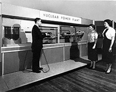 A representative from the Atomic Energy Commission talks about nuclear energy with visitors to the Oregon Centennial Exposition. (Image: Oregon Historical Society)
