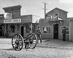 Actors playing “Doc Holliday and his deputy, the Durango Kid” get ready to stage one of their daily gunfight shows in Frontier Town during the Oregon Centennial Exposition. (Image: Oregon Historical Society)