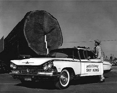 A representative of the helicopter-logging company Sky King stands next to his company’s brand-new 1959 Buick looking at an exhibit of an enormous old-growth log at the Centennial Exposition. (Image: Salem Public Libraries)
