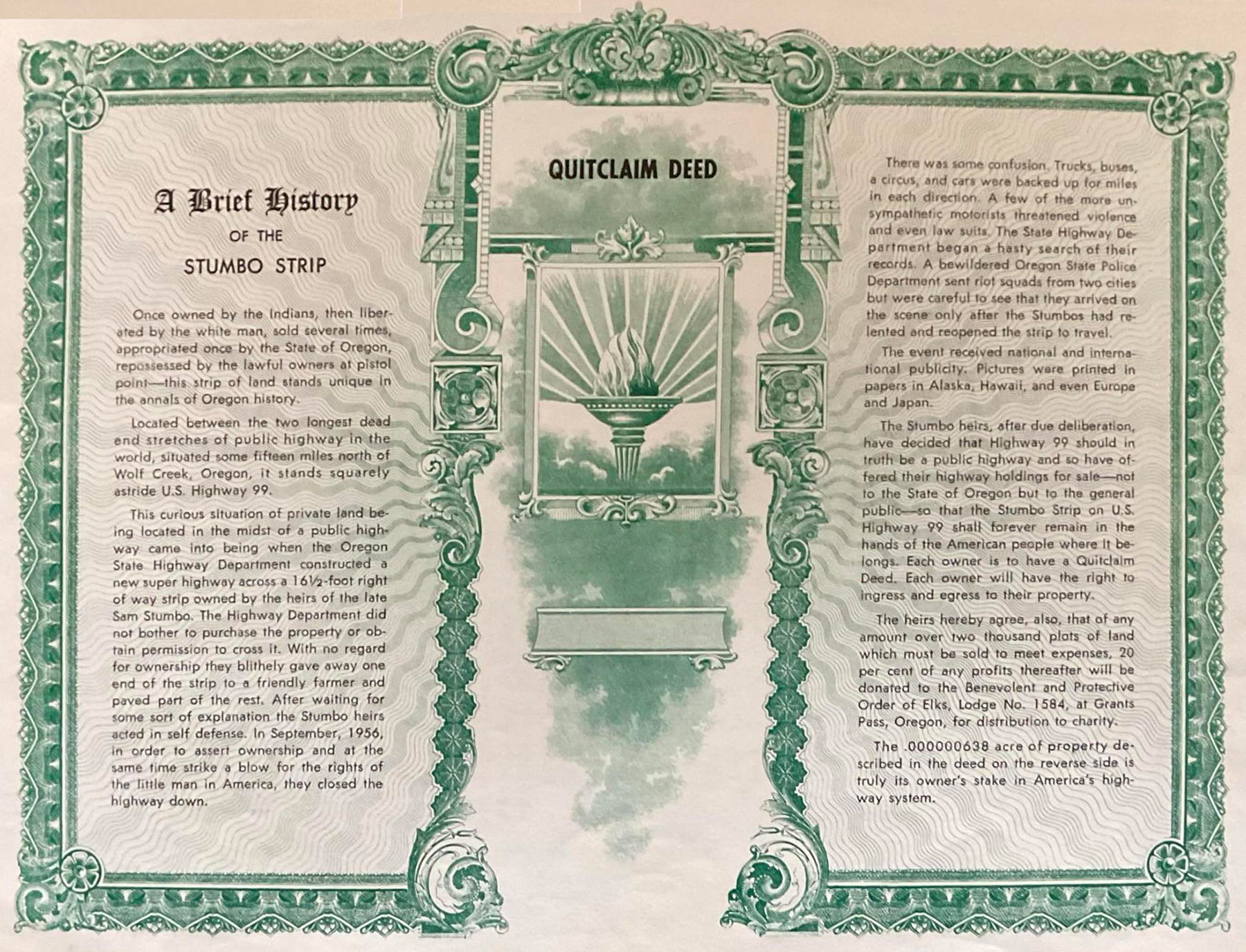 One of the quitclaim deeds used to sell four-square-inch plots of Highway 99 as part of the “Stumbo Standoff” with the Oregon Highway Department.