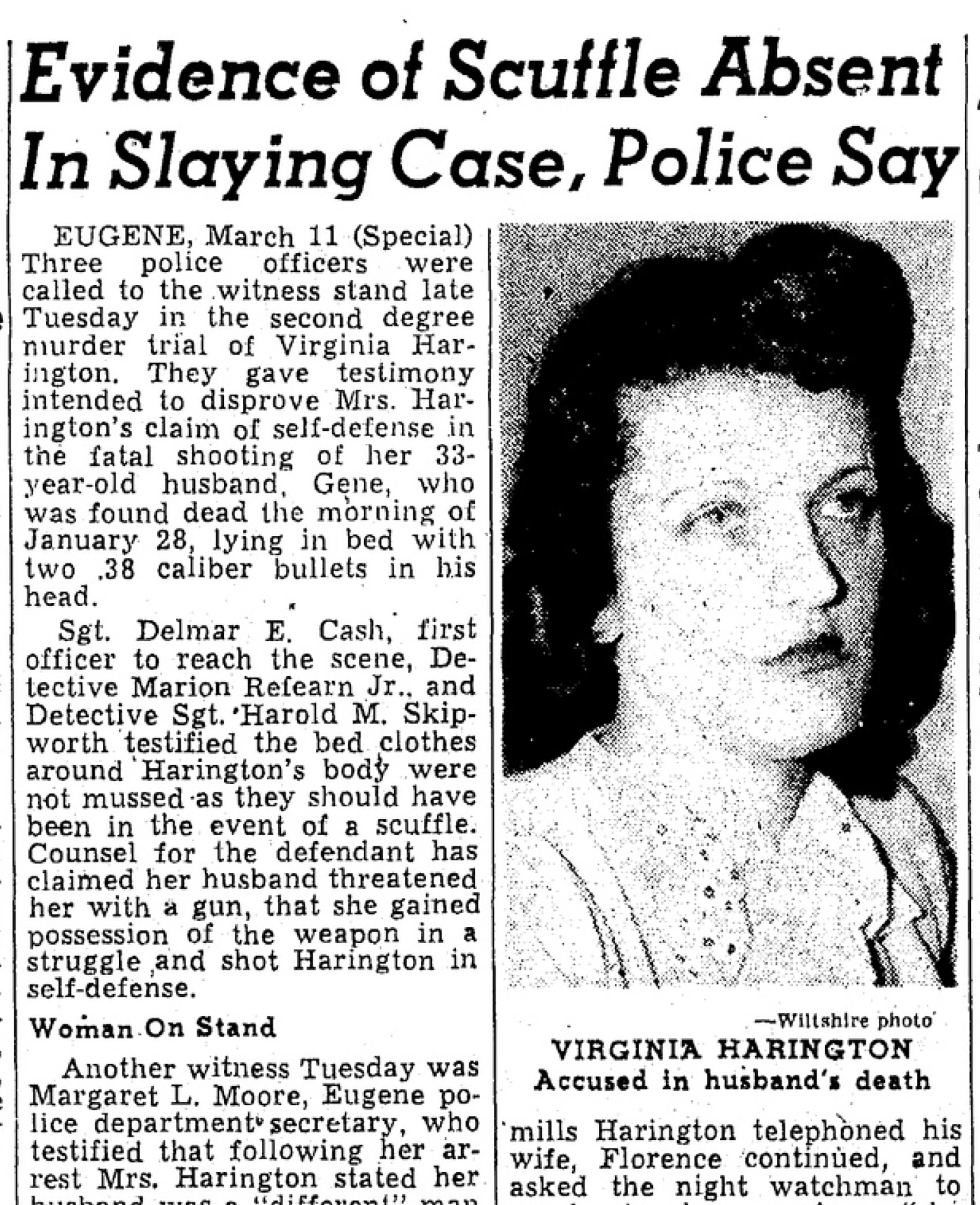It no doubt helped a great deal that in court, Virginia did not behave at all like a murderess is assumed to act. She was very worried about the two babies, while they were in state custody waiting for their grandmother to arrive from San Jose; and she was quite emotional in all the right ways during her testimony. Of course, some murderers are very good at that kind of acting; but it seems unlikely a 23-year-old would have acquired such skills. And yet her account of how the shooting happened rings very false. To snatch a gun from the hand of a much stronger person, shift one’s grip on the gun without using the other hand (remember, she said he was holding her arm) and, firing unaimed in double-action mode with her wrist bent, punch two rounds dead center through the bull’s eye? As anyone who’s fired a double-action revolver will appreciate, it takes a good deal of training to be able to accurately shoot one in double-action mode. The long, heavy pull on the trigger that is required to rotate the cylinder and raise the hammer, and the way the trigger breaks free suddenly when the hammer is released, tends to cause the muzzle to wander. Yet this pretty young mom, the jury members were told, had held the muzzle right on target for two unaimed shots, holding the gun sideways across her body? Even from two feet away, that’s truly Annie Oakley-class trick shooting. One lucky hit would be plausible, but the chance of the second shot also being a near-perfect hit would have been vanishingly slight. The story can basically be dismissed out of hand, and it probably was. So the jury must have decided Harington had had it coming. Or maybe they just didn’t want to finish the job of making orphans of their two kids. Either way, they came to their verdict very quickly and decisively. As a side note, the newspaper coverage of the Harington case was fairly subdued, probably because it was overshadowed by the far more salacious case of Gladys Ralphs Broadhurst, the bigamous “film noir murderess” from Malheur County, which took place at roughly the same time. (Here is a link to that story.) Newspaper stories about the two murders appeared next to each other several times during the trial.