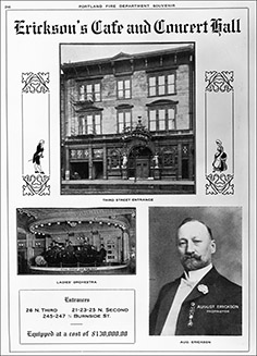 THE GLORY YEARS of Erickson’s lasted nearly two decades, until a fire broke out in 1913 and damaged the place severely; by the time it was repaired, Prohibition had kicked in. Even fairly early on, though, it was increasingly clear that Erickson was losing his battle with alcohol, and he started appearing with increasing regularity in the police blotter. In 1906 he sold half of the business to Fred Fritz; in 1915 he sold the rest, and moved to Oregon City to open the Clackamas Tavern.