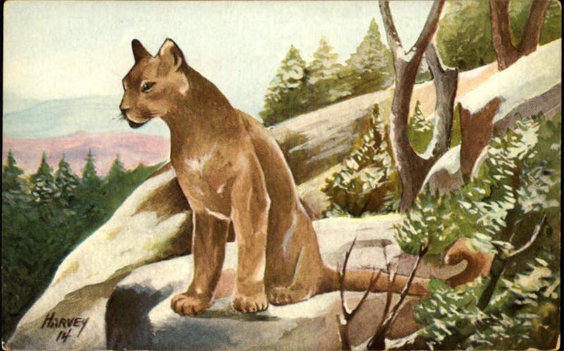 A 1914 painting of a cougar from a vintage postcard, artist unknown.