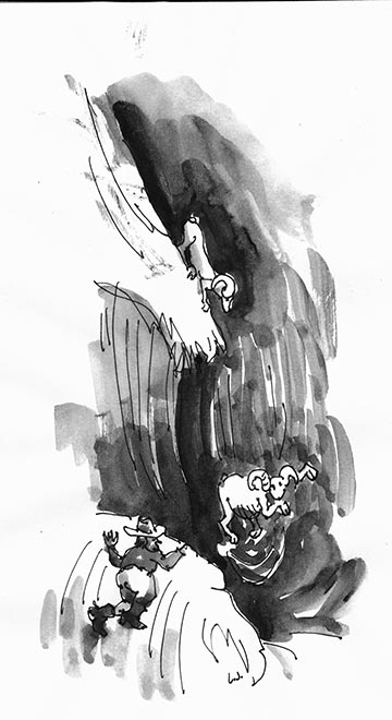 Reub saw his opportunity. “Yes, that is part of the reason,” he said smoothly. “But those thick skulls are on the females too, and they don’t fight. The sheep grazed on mountainsides, too steep and rough for other animals. Often a mountain ledge will follow along for hundreds of feet, then pinch out … When they got into such a deal, they couldn’t back up without stepping off the ledge. These thick skulls saved them. They’d calmly hurl themselves off the ledge, head down, and they could land on the rocks below without harm.”