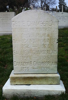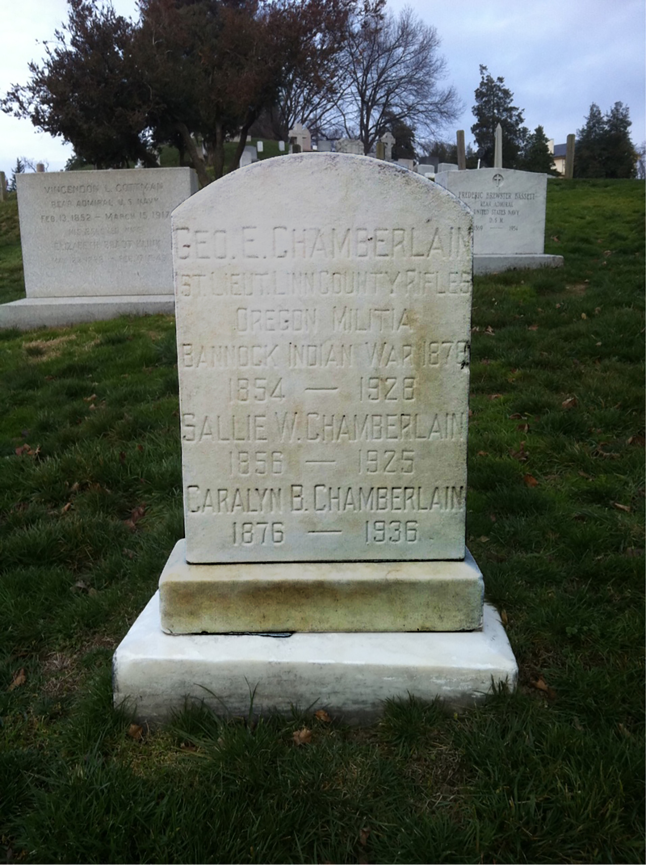 The grave marker for George Chamberlain and his first and second wives, Sallie and Caralyn, at Arlington National Cemetery. (This image has been heavily adjusted to enhance readability.) (Image: Arlington National Cemetery)