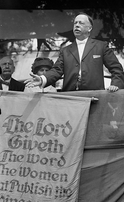Senator George Chamberlain speaks at the historic July 31, 1913, meeting of Suffragettes in Hyattsville, Md. The woman seated directly behind him is not identified by the photographer, but is almost certainly Caralyn B. Shelton. (Image: Library of Congress)