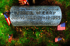 Trouble they wanted, and trouble they got. On Oct. 26, 1881, Cowboy honchos Billy Clanton and Frank McLaury strutted into town with Colts on their hips, in violation of the town ordinance (which required all guns be checked in at a saloon or hotel immediately upon entry into city limits). Virgil deputized his brothers Wyatt and Morgan along with Wyatt’s buddy John “Doc” Holliday, and confronted Clanton and McLaury along with two other Cowboys in a vacant lot behind the OK Corral. “Boys, throw up your hands. I want your guns,” Virgil told them. Famously, they threw up their hands with iron in their fists, spitting lead at the lawmen, who were ready for them. In the ensuing firefight, three of the Cowboys were killed, the fourth ran for his life, and Virgil and Morgan both took serious but not life-threatening bullet hits. The Cowboy who ran from the fight pressed murder charges against the Earps and Holliday, but the charges were dismissed in court. So two months later, other members of the Cowboy gang tried to take vengeance. They hid out in an empty building and ambushed Virgil with shotguns as he walked out of his hotel, nearly killing him and leaving him with a permanently crippled left arm. Three months after that, someone shot Morgan through a pool-hall window, killing him.