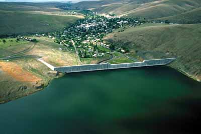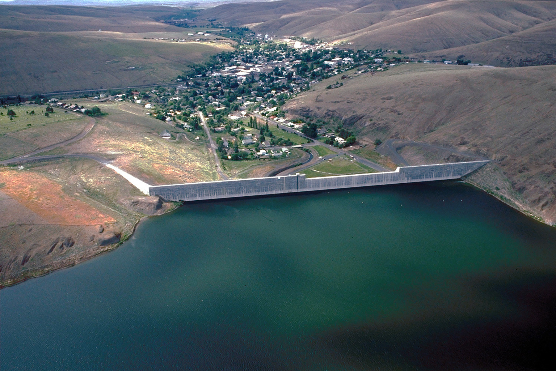 Heppner as it appears today, in an aerial photo from above the Willow Creek Dam — which, despite its ominous appearance, protects the town from the very disaster it appears to threaten in this photo. (Image: Army Corps of Engineers)