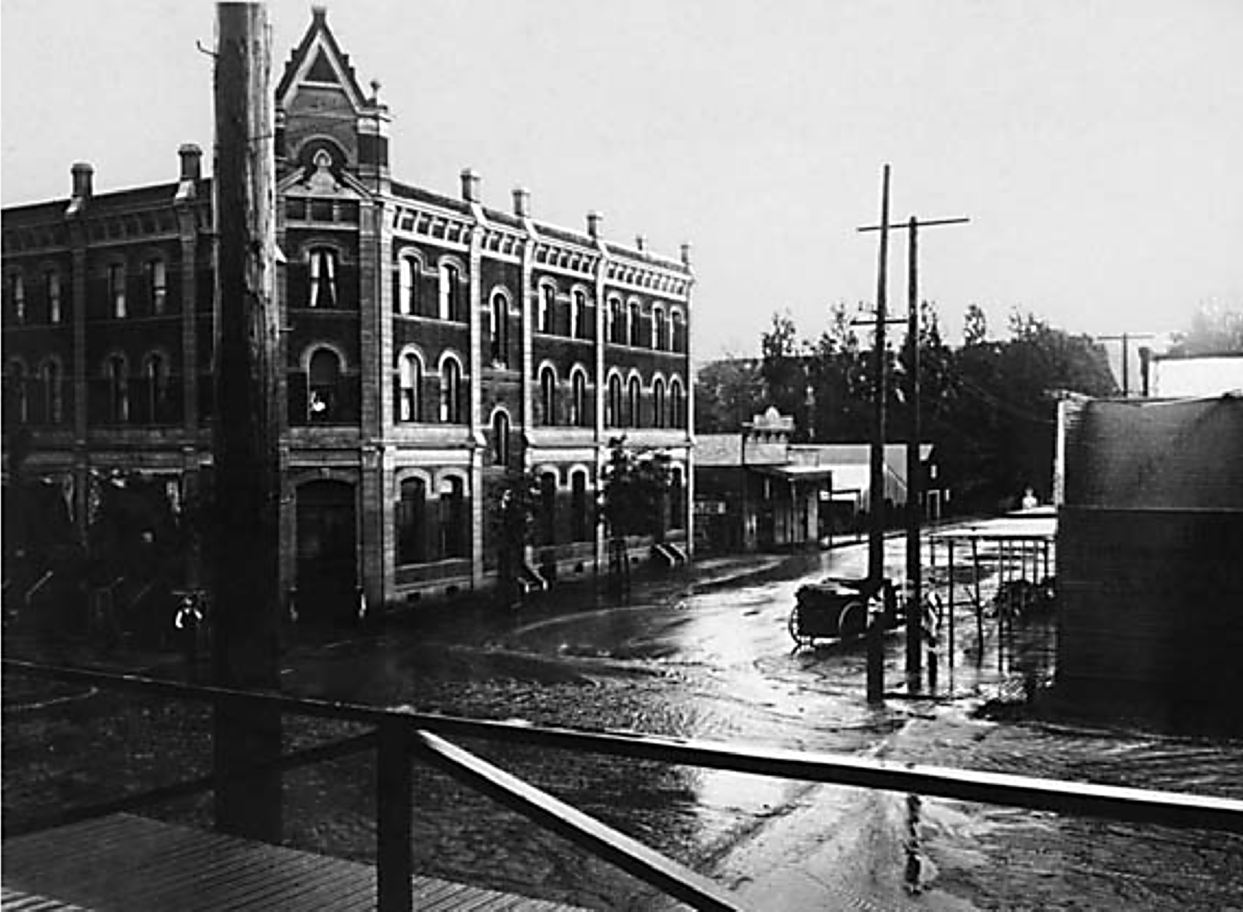 This eerie photo of Main and May streets was taken less than two minutes before the wall of water swept through, showing the minor flooding that preceded it. By the time photographer Bert Sigsbee took this photo, the flood was already killing people on the other side of town. The large brick building is the Palace Hotel. (Image: UW Press)