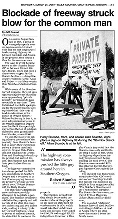 (Sources: “Blockade of Freeway Struck Blow for the Common Man,” an article by Jeff Duewel published in the March 25, 2010, issue of the Grants Pass Daily Courier; “’Stumbo Strip’ stirs feud into Oregon-wide affair,” an article by John Terry published in the April 23, 2011, issue of the Portland Oregonian; recorded judgment by Supreme Court of Oregon in State Highway Commission v. Stumbo Et Al, March 25, 1960; correspondence with Stacy Stumbo)