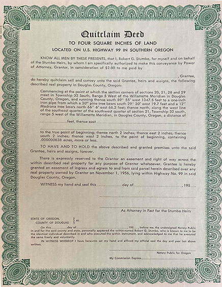 One of the quitclaim deeds used to sell four-square-inch plots of Highway 99 as part of the “Stumbo Standoff” with the Oregon Highway Department.
