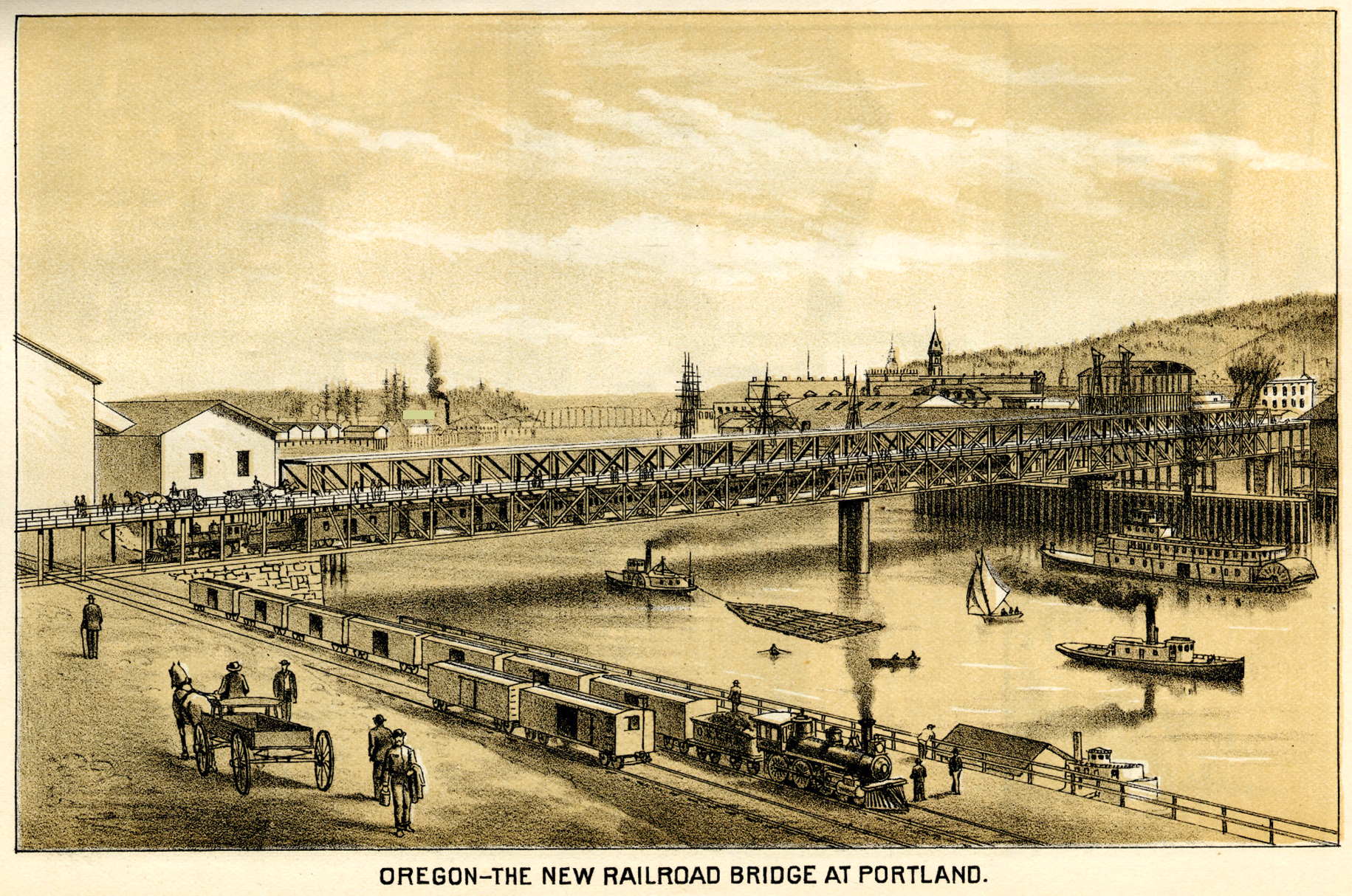 An image of the brand-new Steel Bridge, the first bridge built in Portland, in 1887. This image may actually have been drawn from plans before the bridge was in operation. This bridge lasted less than 30 years before it was torn down and replaced with the Steel Bridge we know today. (Image: The West Shore)Finally, in 1882, the two towns made common cause and launched what was probably Oregon’s first-ever inter-agency prostitution sting — attacking from both sides at once. For some reason, Nancy had not moved the boat, leaving it nicely positioned in the center of the river — although it quickly became clear that the raiders were expected. From this commanding position, she and her lieutenants opened fire on the approaching police boats with steam hoses rigged to the boat’s heating plant, blasting scalding steam accompanied by savage screams and curses that could clearly be heard by watching City Hall VIPs on both sides of the river. The steam, of course, made a tremendous hissing and impressive clouds as it blasted out into the chilly spring air. It must have looked like a spectacular battle. And faced with such determined and dangerous-looking opposition, the cops conducted a strategic retreat. It’s hard to avoid the impression, from Spider Johnson’s account of this engagement, that it was intended to look a lot fiercer than it actually was. Mayors and police chiefs might have wanted Nancy shut down, but she clearly had some good friends among the regular beat cops on both sides of the river. But that night, under cover of darkness, someone apparently cut Nancy’s anchor line, setting her bordello drifting helplessly down the river toward the sea. And it was moving at a pretty alarming pace. Despite its reputation as a slow and easy waterway, the lower Willamette moves right along when the water is high, as it usually is in the spring ... and as it definitely was at this particular time. As almost any Victorian-era woman would, Nancy first went for help to the one man still on board, a customer who had hit the jug especially hard and was sleeping it off. This fellow was every bit as helpful as you would expect a man like that to be. So Nancy let him sleep and, with a few words of reassurance to her girls, got in one of the rowboats and started pulling for the east side of the river. She came ashore in Albina, and immediately sought out the skipper of a sternwheeler whom she knew. After she explained to him that a barge full of girls and whisky was in distress and needed help, the captain rousted his crew, fired the boilers and headed downriver to the rescue. At dawn the next morning, Nancy’s “hospitality” barge was back at anchor. One source says it was right back where it was the night before, in a little thumb-in-the-eye to whoever had tried to get rid of it; several other sources, including Spider Johnson, say it ended up anchored a few miles down the river, near Linnton. Quite what arrangement Nancy and her girls made with the captain and crew of the sternwheeler to thank them for their gallant midnight rescue is, happily, lost to posterity.