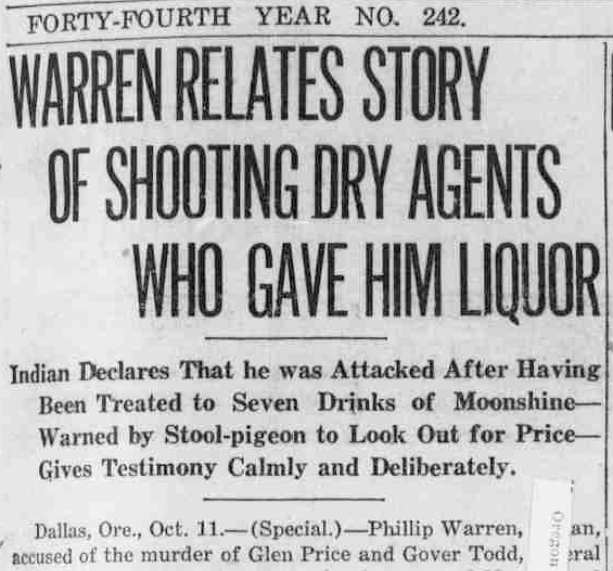 In Grand Ronde, moonshiner Perry introduced agents Price and Todd to two local men, Phillip Warren and his friend Henry Petite — both members of one of the Confederated Tribes of Grand Ronde — and asked if the two of them could find some liquor for them. When they furnished a pint of white lightning and received $2 for it, agent Price tried to arrest them. The two men resisted — Petite ran for it, and Warren tried to follow suit but Price clubbed him with the butt of his gun, opening a wound over his eye and dazing him.