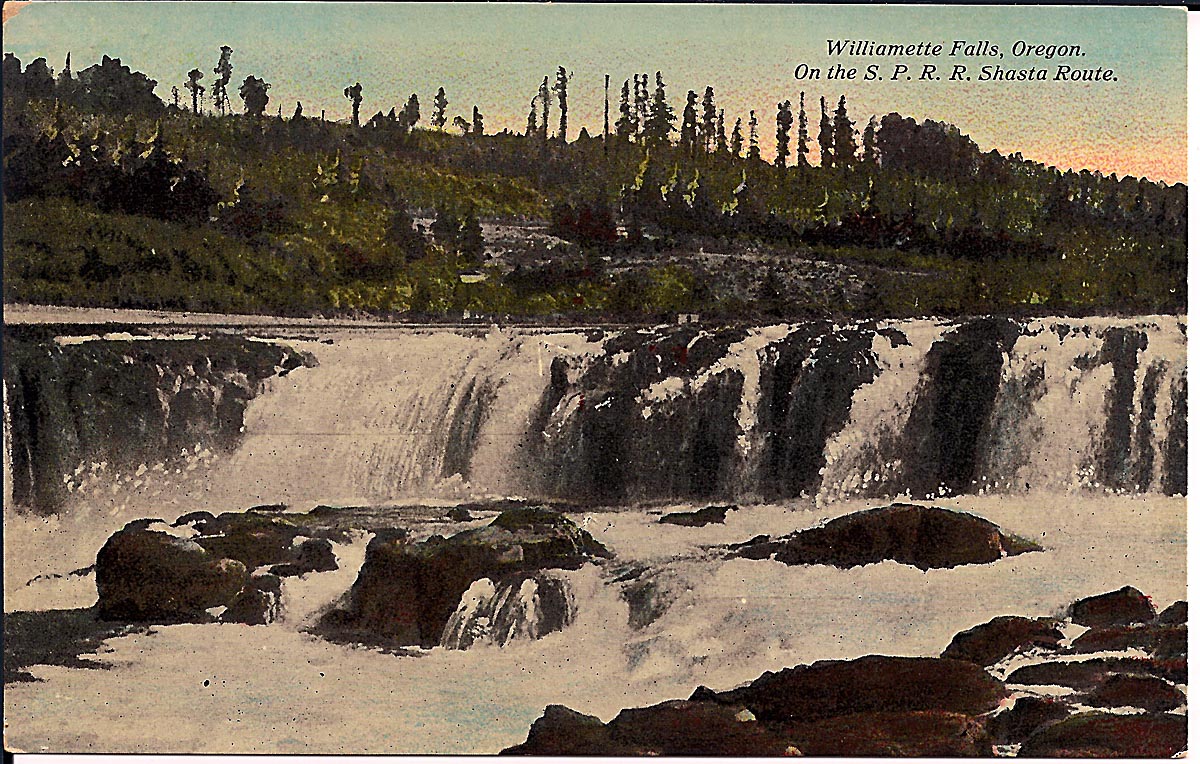 This image of Willamette Falls before the build-up of paper mills on either side comes from a postcard dating from circa 1920.